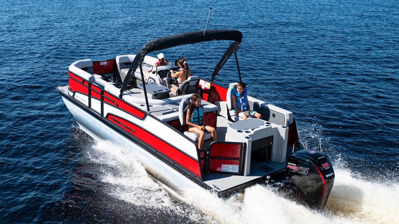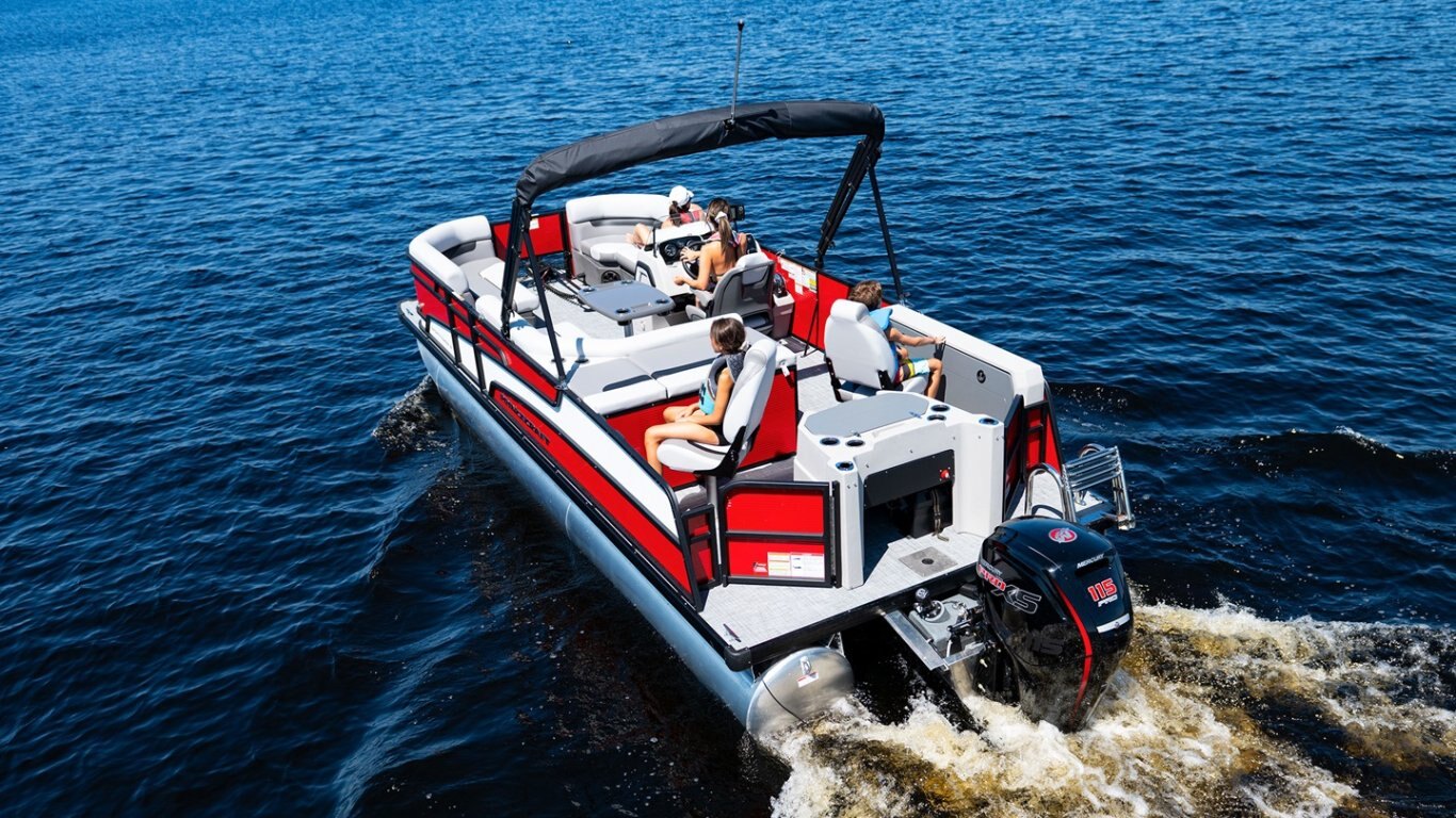 - Protective cover (black) for pontoon with an electric bimini and performance configuration