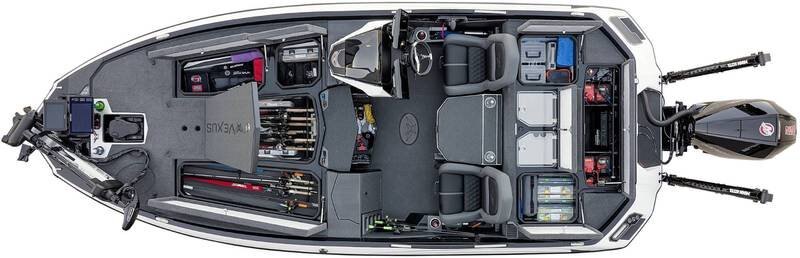 Detail after detail, the entire design is loaded with state-of-the-art features. The wider bow fork not only includes a built-in wedge for the trolling motor, but it also delivers more square footage for multiple anglers up front. Even the forward cup holders are handily reached in the midst of oversized, stacked electronics. Storages feature air assists on the lids as well as raised moisture dams, ultra-thick rubber seals, and stainless steel compression latches for optimum wet-weather confidence. Under the massive front deck, space abounds, and rod capacity is enormous. The 8’ 6” port compartment provides a world of room for dozens of sticks while rods and 3700-sized tackle boxes can be arranged in multiple ways inside the center box. Just in front of the console, the reinforced day box is built to keep priority tackle close at hand.